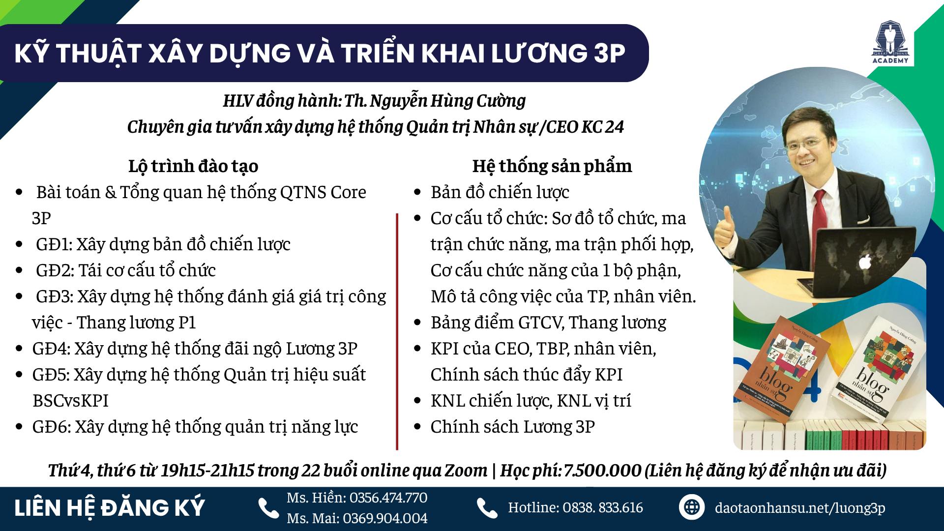- Khóa hoc "Kỹ thuật xây dựng hệ thống Quản trị nhân sự core - lương 3P (12 lớp): Chia sẻ kinh nghiệm và kiến thức để giúp các công ty xây dựng thành công hệ thống Quản trị nhân sự theo 3P.