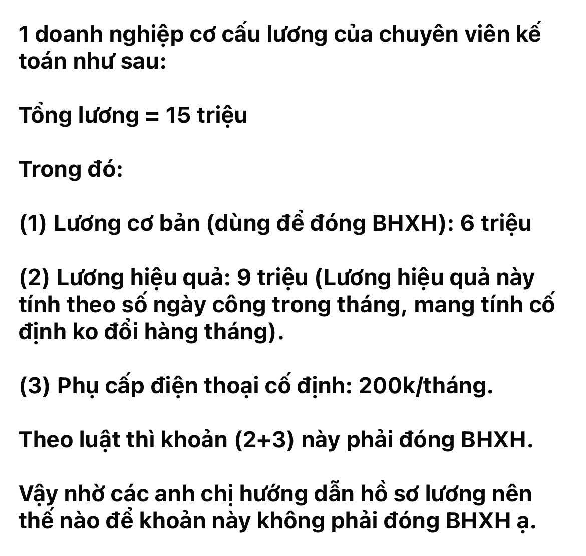 Theo luật thì khoản (2+3) này phải đóng BHXH. Vậy nhờ các anh chị hướng dẫn hồ sơ lương nên thế nào để khoản này không phải đóng BHXH ạ.”